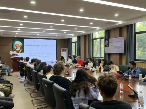 7月8日上午,温权教授以“维吾尔古典诗学的光辉历程”为主题,开启了一场思想的盛宴。他深入讨论了《维吾尔古典诗学简论》,从维吾尔古典诗学的发展脉络,到法拉比的深邃哲学与文学理论,再到苏菲主义的神秘诗学,以及维吾尔诗学中的启蒙思想和《智慧之光》中的伦理价值,温教授的讲座不仅丰富了来访师生的知识视野,更激发了他们对维吾尔古典诗学的热情与好奇。现场气氛热烈。