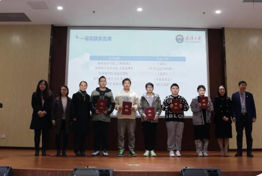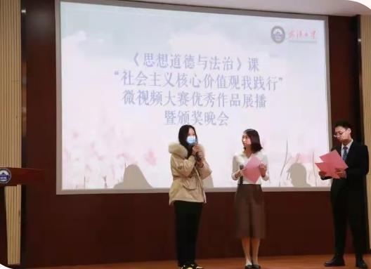 一等奖展播代表作品是来自化学与分子科学学院廖乙团队的《你未曾离去》。该作品另辟蹊径,极富创意地以“套中人”的内心独白与转变故事,突出了社会主义核心价值观是日常生活中无时不在的存在,活灵活现地彰显了其对大学生成长成人成才的重要意义,无论是思想内容还是艺术呈现都令人印象深刻。采访环节中主创代表廖乙同学分享了团队成员的创作灵感和拍摄感悟,表示此次活动切实加强了自己对社会主义核心价值观的感知,在以后的学习生活中将争做践行者。接着,本科生院副院长吴丹、党委宣传部副部长张岱、学工部副部长仲华、校团委副书记王园、思想道德与法治课程中心主任佘双好五位领导老师为5个一等奖获奖团队颁奖。