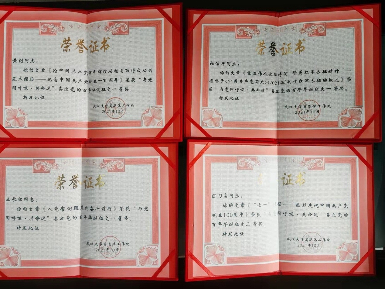 在“与党同呼吸•共命运”主题征文活动中,永利官网和离退休教职工们积极响应、踊跃参与,以不同视角抒发了对伟大的党、伟大祖国的热爱之情。永利官网老年协会荣获“优秀组织奖”,其中王长铭教授《入党誓词鞭策我奋斗前行》,杜传平教授《重温伟人长征诗词 赞美红军长征精神——有感于<中国共产党简史(20210版)关于红军长征的概述》、黄钊教授《论中国共产党百年辉煌历程与取得成功的基本经验——纪念中国共产党诞生一百周年》荣获文章类一等奖,陈乃宣教授《”七一“颂歌——热烈庆祝中国共产党成立100周年》荣获文章类三等奖,王长铭教授《六唱母亲——百年华诞唱给母亲的歌》和陈乃宣教授《同舟共济度时艰》荣获诗词类纪念奖。