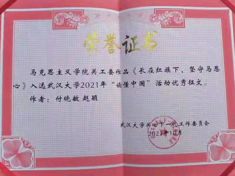 在“读懂中国”活动中,永利官网积极组织青年学生和老党员代表进行深入交流,挖掘、记录、整理他们的入党初心和历程及为党奋斗的感人事迹和真实感悟并进行充分展示和广泛传播,取得了很好的教育效果和社会影响。学院关工委被评为“优秀组织单位”;文章《听老教授漫话人生》荣获”最佳征文“称号;文章《初心如磐志高远,奋楫笃行践使命》、《长在红旗下,坚守马恩心》被评为“优秀作品”。